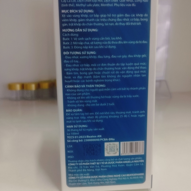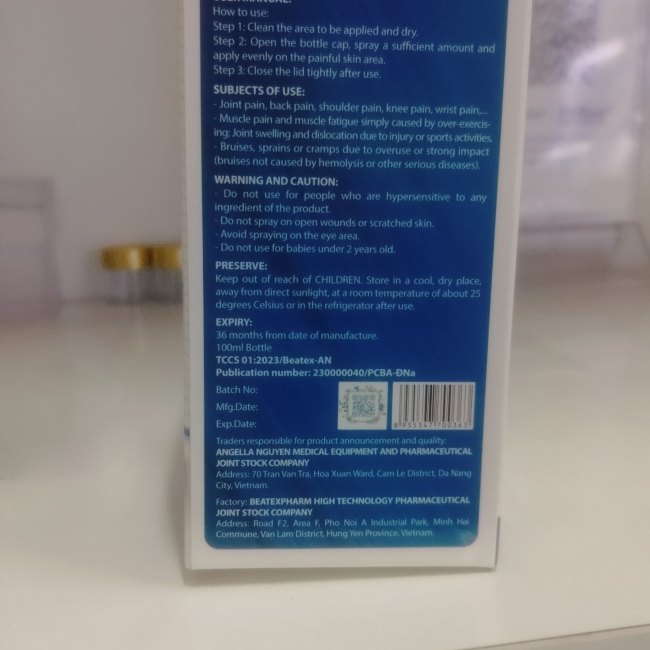 Dùng cho: - Đau nhức xương khớp, đau lưng, thoát vị đĩa đệm, thoái hóa cột sống, đau vai gáy, đau khớp gối, đau cổ tay… - Đau nhức cơ bắp, mỏi cơ đơn thuần do tập luyện quá mức, sưng khớp – trật khớp do chấn thương hoặc vận động thể thao. - Bầm tím, bong gân hoặc chuột rút do vận động quá mức, va đập mạnh ( Bầm tím không do nguyên nhân tan huyết hoặc các bệnh nghiêm trọng khác) Hướng dẫn sử dụng: - Vệ sinh sạch vùng cần bôi, lau khô - Xịt một lượng vừa đủ thoa đều lên vùng da bị đau, ngày 4 lần. Cảnh báo: - Không dùng cho người mẫn cảm với bất kì thành phần nào của thuốc - Không xịt lên vết thương hở hoặc vùng da bị trầy xước - Tránh xịt lên vùng mắt - Không dùng cho trẻ dưới 2 tuổi - Không được uống.